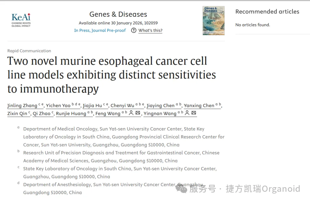 [1]Zhang J, Yao Y, Hu J, Wu C, Chen J, Chen Y, Qin Z, Zhao Q, Huang R, Wang F, Wang Y, Two novel murine esophageal cancer cell line models exhibiting distinct sensitivities to immunotherapy, Genes &Diseases, https://doi.org/10.1016/j.gendis.2026.102059