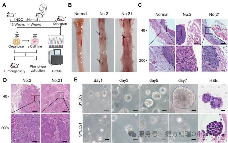 (B)30周后,从对照组和实验组中分离出的食管组织。正常组织来自饮用普通水的对照组,而2号和21号组织来自实验组(饮用4-NQO 16周,之后饮用普通水14周)。