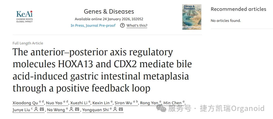 [1]Qu X, Yao N, Li X, Lin K, Wu S, Yan R, Chen M, Liu J, Wang N, Shi Y, Theanterior‒posterior axis regulatory molecules HOXA13 and CDX2 mediate bile acid-induced gastric intestinal metaplasia through a positive feedback loop, Genes & Diseases, https://doi.org/10.1016/j.gendis.2026.102052.