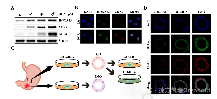 从患者IM组织和周围正常组织建立胃类器官模型:正常胃类器官(GO) + DCA处理 → 高表达HOXA13和CDX2,类似患者来源的IM类器官(IMO)。在GES-1和胃癌细胞中过表达HOXA13,会上调CDX2和KLF4;敲低HOXA13则下调这些标志物。 本研究结合生物信息学筛选 + 临床样本验证 + 多种动物模型 + 类器官模型 + 分子机制实验,首次揭示HOXA13在胃IM中的关键作用,拓展了Hox家族在胃癌前病变中的功能。阐明了胆汁酸-FXR-HOXA13-CDX2正反馈环路在IM发生和维持中的核心机制,为胃癌预防提供了新的潜在靶点:通过干预HOXA13或FXR来阻断或逆转IM。