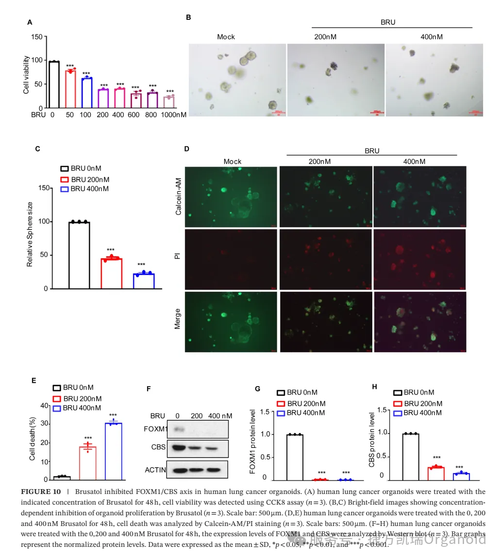 (B, C) 明场图像显示鸦胆子苦醇对类器官增殖的浓度依赖性抑制作用(n = 3)。比例尺:500 μm。(D, E) 肺癌类器官用 0、200 和 400 nM 鸦胆子苦醇处理 48 小时,通过 Calcein-AM/PI 染色分析细胞死亡情况(n = 3)。比例尺:500 μm。(F–H) 人肺癌类器官用 0、200 和 400 nM 鸦胆子苦醇处理 48 小时,通过 Western blot 分析 FOXM1 和 CBS 的表达水平(n = 3)。条形图表示标准化后的蛋白水平。数据以平均值 ± 标准差表示,p < 0.05,p < 0.01,p < 0.001。